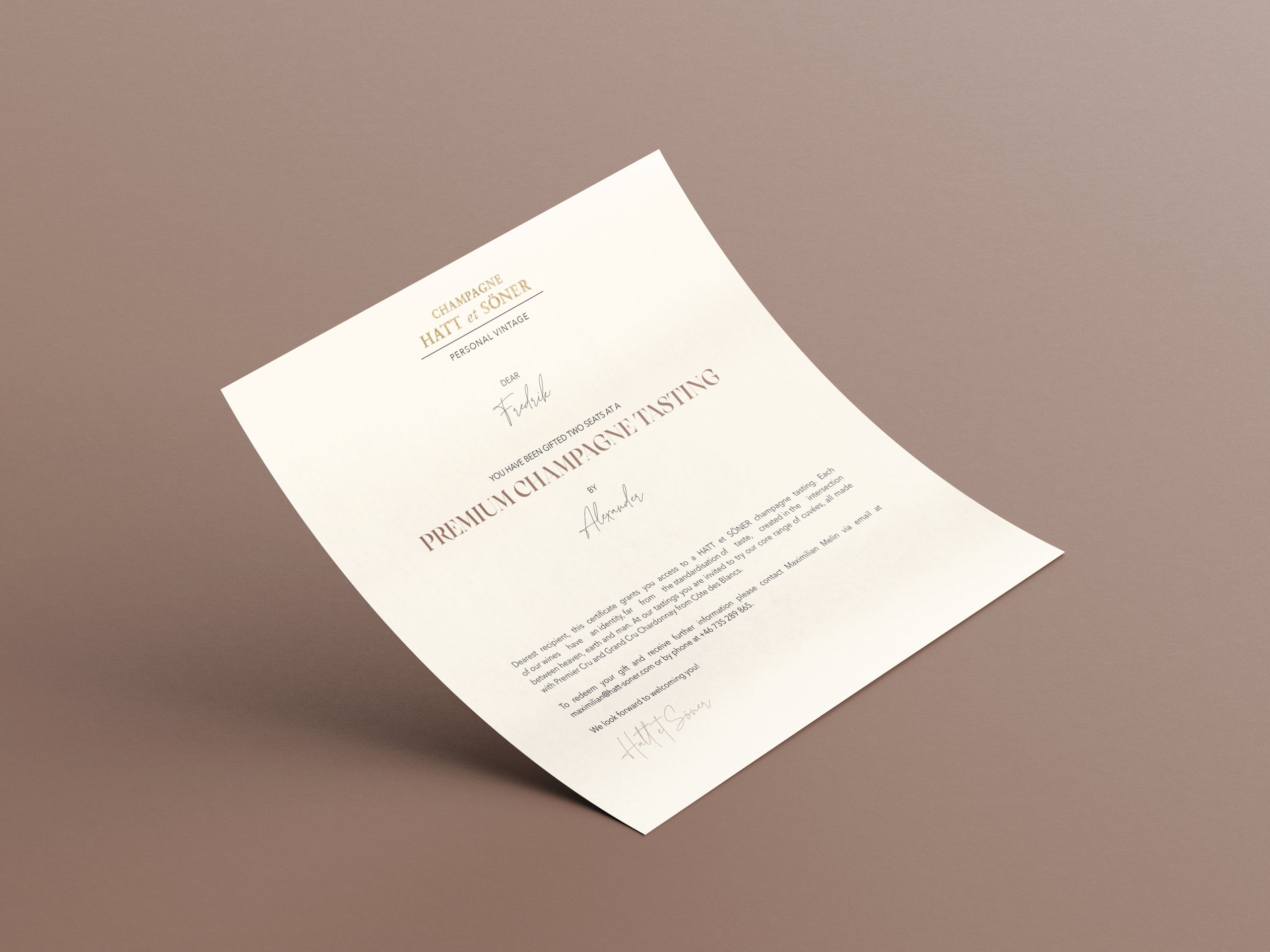 This certificate grants you access to a HATT et SÖNER champagne tasting. Each of our wines have an identity, far from standardisation of taste, created in the intersection between heaven, earth and man. At our tastings you are invited to try our core range of cuvées, all made with Premier Cru and Grand Cru Chardonnay from Côtes des Blancs.